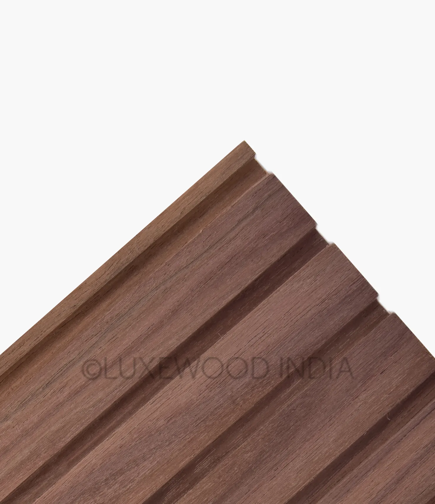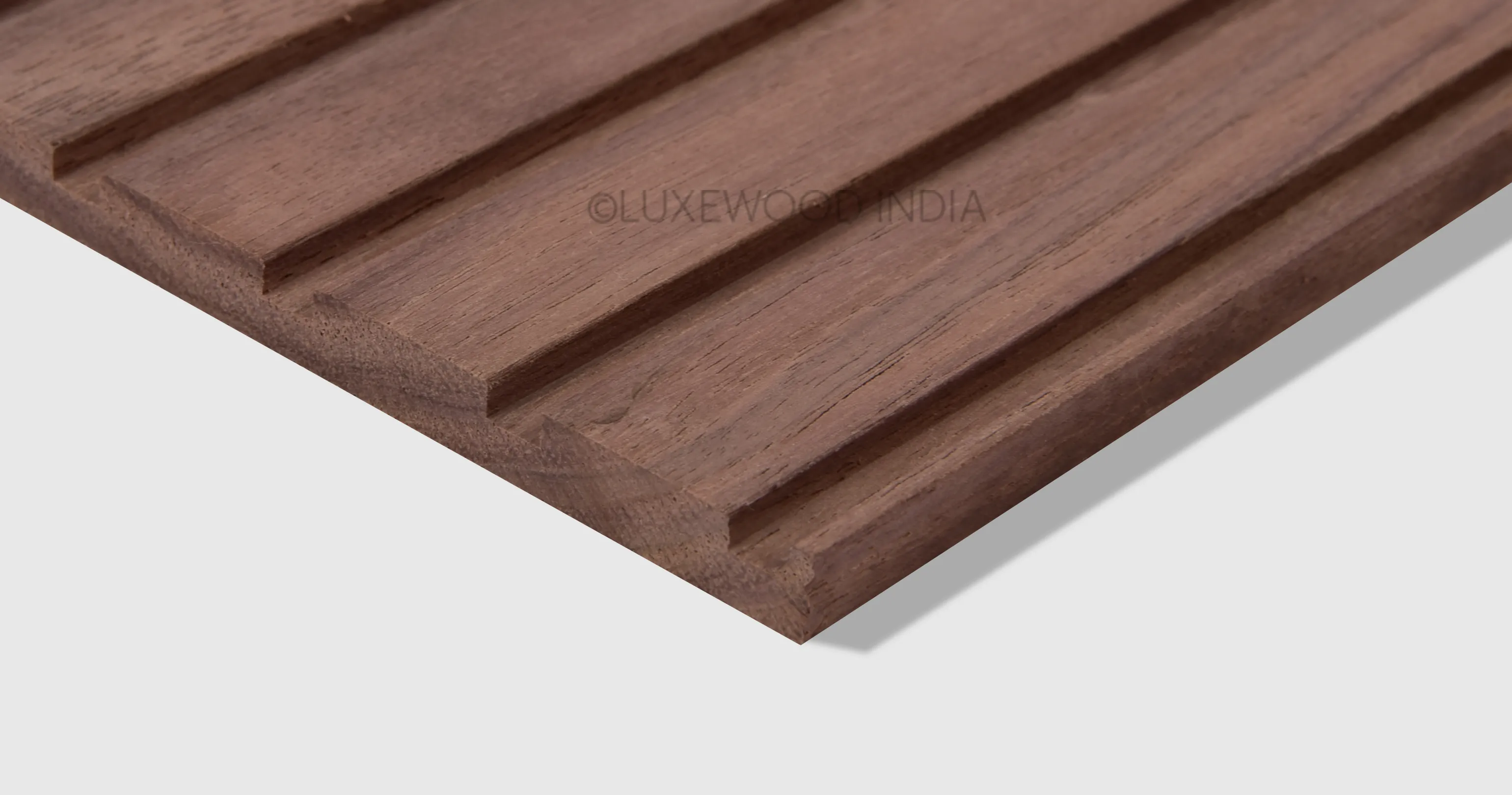 Thermo American Walnut Trio Slim Planks showcase the wood's natural beauty, boasting a distinctive creamy white to dark chocolate brown hue with occasional purplish casts and darker streaks. The slim planks feature a natural finish that preserves solid wood's authentic look and feel, with the thermo-treated surface enhancing stability, ensuring durability, and maintaining a refined appearance. This reflects Luxewood India's commitment to seamlessly blending aesthetics with performance.